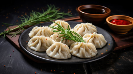 chinese dumplings, a traditional dish, are beautifully presented in this dark gray and beige styled photo by yervand kochar. the dumplings are served with a bowl of soy sauce, salt, and rosemary, adding a touch of flavor and aroma. prateep kochabua captures the unpolished authenticity of this multi-layered, matte image, creating a visual feast that is both enticing and appetizing. mons desiderio. ai generated
