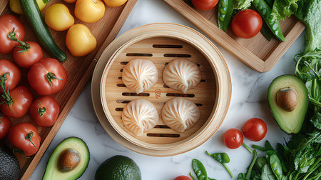 Chinese dumplings in bamboo steamer with vegetables background