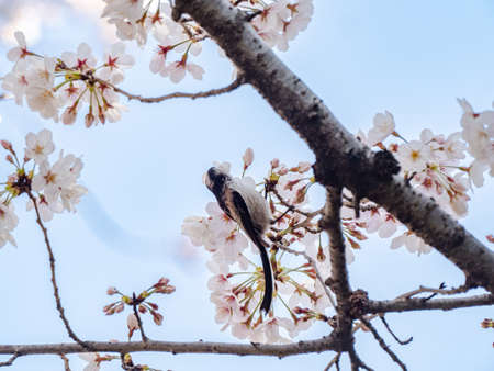 A small long tailed bushtit, Aegithalos caudatus, perches among blooming cherry blossoms in a small park near Yokohama, Japan.
