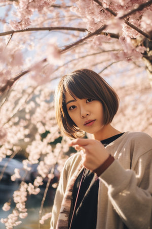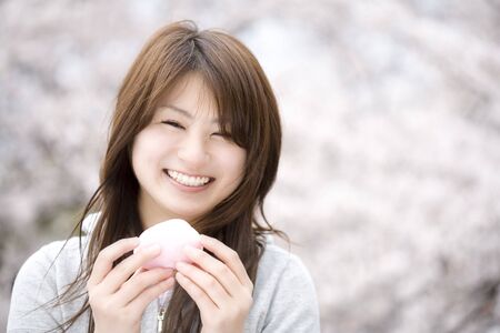 A portrait of Japanese woman behind cherry blossom in Tokyo copyspace