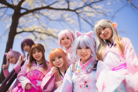 Group of anime girls outdoor. Cute japan teenagers sitting nearly tree and looking at camera. Smiling ladies together on spring on summer day. Generative AI