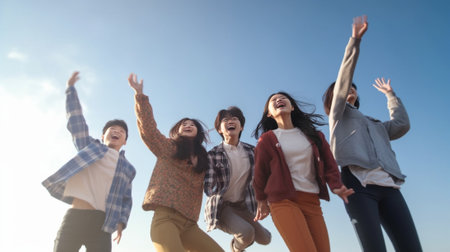 Forever young Low angle view of four young happy people holding hands and raising them up with blue sky as background : Generative AI