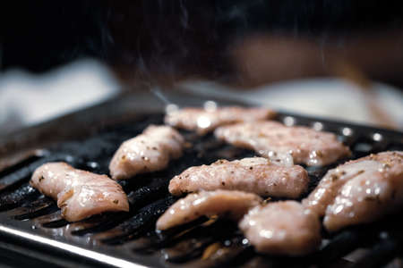 Grilled raw meat beef and pork (barbeque, bbq) a food cooking on wagyu grill in BBQ. yakiniku grill buffet restaurant