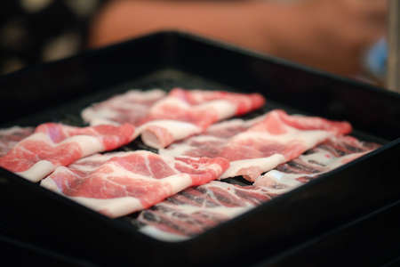 Raw pork in plate on sliding rail of shabu boiled