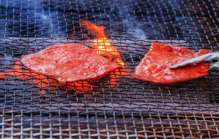 Grilled raw beef slice on flaming charcoal grill