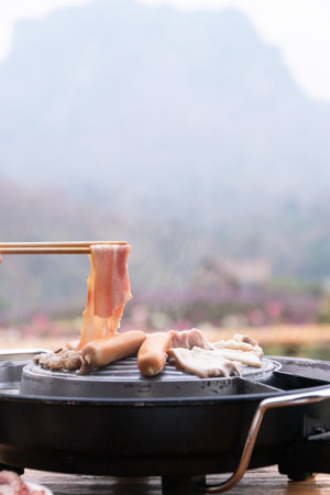 Grilling sliced pork and Marshmallows on asian grill style