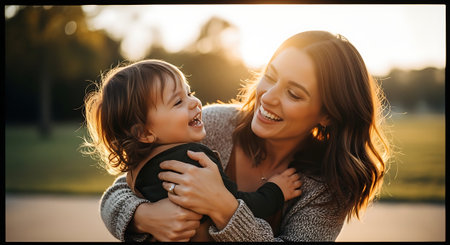 A joyful mother holding her laughing child outdoors during sunset. Both are smiling, with warm sunlight illuminating their faces in a serene park setting.