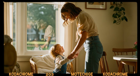 A mother assists a young child in standing near a window in a warmly lit room. The scene captures a tender moment with natural light and greenery outside.