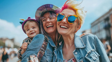 Two grandmothers and grandchild are enjoying a sunny day together, creating heartwarming memories filled with laughter and love