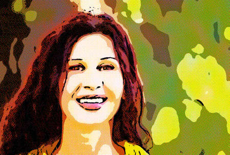 illustration of a beautiful smiling deep eyes mature woman, Caucasian but with Arabic or Middle Eastern features, holding her chin with hands