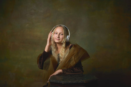 Music. Beautiful young girl with long blonde hair wearing medieval dress posing over dark vintage background. Retro style, art, fashion, comparison of eras concept.