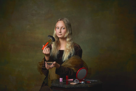 Beaty. Beautiful young girl as Mona Lisa picture using makeup brush over dark vintage background. Retro style, art, fashion, comparison of eras concept.