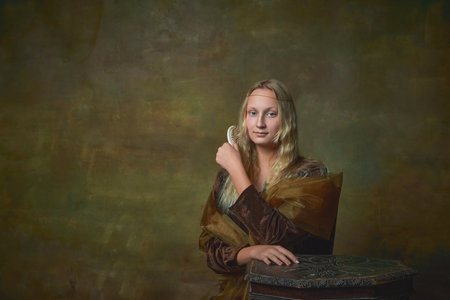 Portrait of young girl as Mona Lisa picture posing over dark vintage background. Retro style, art, fashion, comparison of eras concept.