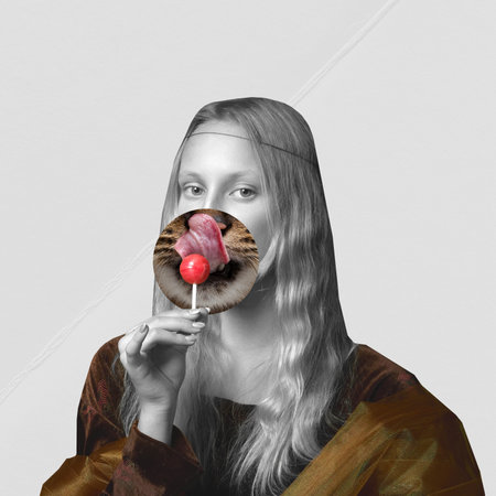 Contemporary art collage. Vibrant, reimagined portrait of Mona Lisa with bold, saturated colors and abstract shapes. Blends of Renaissance art with modern pop art aesthetics
