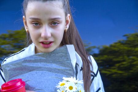 Portrait of beautiful young girl walking outdoors in autumn. She poses for the camera