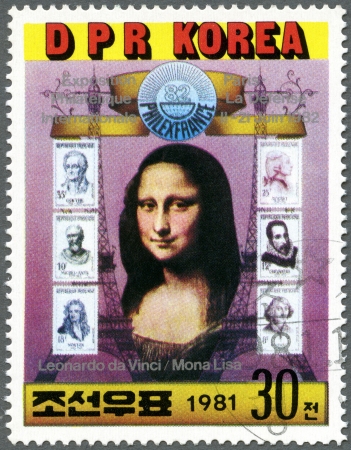NORTH KOREA - CIRCA 1981: A stamp printed in DPR Korea shows Mona Lisa and six French stamps, Philexfrance '82 International Stamp Exhibition, Paris, circa 1981