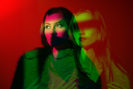 Fashion and bright colors. Portrait of a stylish brunette model posing in a fuchsia blouse and a green fur coat on a red background in green lighting. Studio shot. Copy space. Makeup and cosmetics.