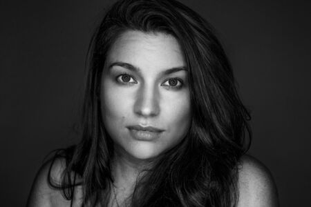 portrait of beautiful dark-haired girl with low-cut long hair and white t-shirt in black and white