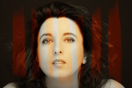 Beauty, Fashion concept. Close up portrait of an attractive brunette girl posing in color mixed light. Makeup and cosmetics, jewelry. Studio shot.