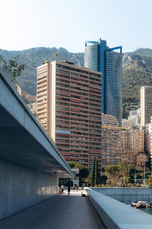 Monaco, Monaco - June 28, 2025: View of Fontvieille district with marina and residential buildings