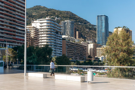 View of La Rousse district in Monaco from Mareterra eco-district with seaside buildings and hills in the background