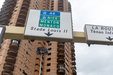 Driving car on narrow streets of Monaco, road signs with directions to Menton, Nice, traffic jam and parking problems in Conte-Carlo