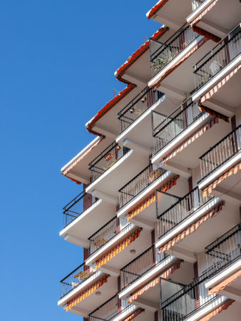 Modern apartment building featuring multiple balconies with orange awnings, set against a clear blue sky, showcasing urban residential architecture in Valencia, Spain.