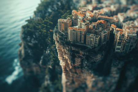 Modern buildings with red-tiled roofs dominate a rocky cliffside, providing breathtaking ocean views as the sun sets in the coastal city, showcasing stunning architecture.