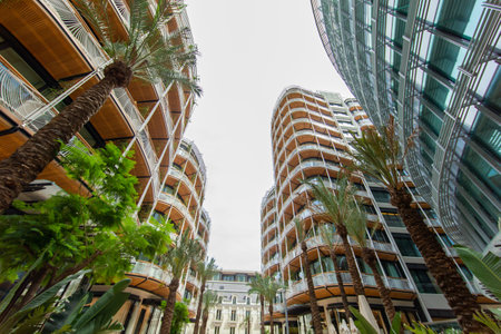 Monaco, Monte-Carlo, 09 July 2019: Facade of the new residential quarter of One, magnificent apartments, a foot zone with a large number magnificent branded shops and restaurants, place Casino, luxury