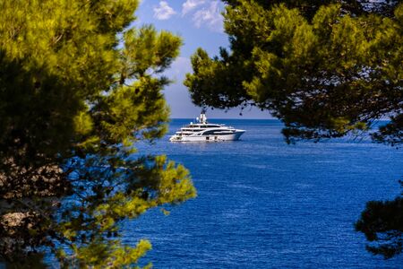 MONTE CARLO, MONACO - AUGUST 21, 2015: Monte Carlo coast with skyscrapers, maritime pines and sea in a sunny summer day in Monaco