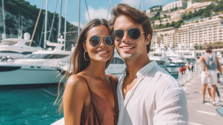Generative AI : Casual young couple smiling outdoor walking in the harbor