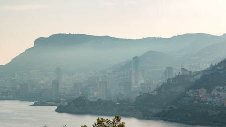 Cityscape of Monte Carlo with morning warm light timelapse, Monaco at summer sunrise. Morning mist. Yachts on harbor. Top view from Cap Martin