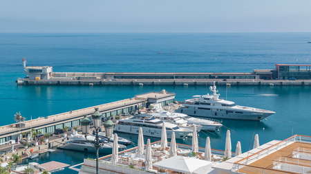 Mediterranean sea, boats and Monaco yacht club timelapse in Monte Carlo district, Monaco. Top view at sunny summer day