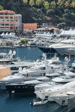 A lot of huge yachts are in port of Monaco at sunny day, megayachts are moored in marina, is a yacht show, Monte Carlo, real estate housing is on background, glossy board of the motor boat