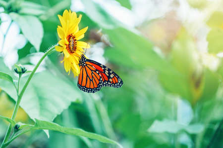 Closeup macro of beautiful amazing red orange monarch butterfly sitting on yellow cute blooming flower in garden park outside. Copyspace for text. Sunny day with sun flare light from above.