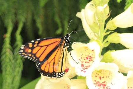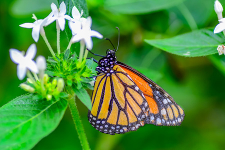 Monarch butterfly (Danaus plexippus) feeding on white flower blossoms in the garden