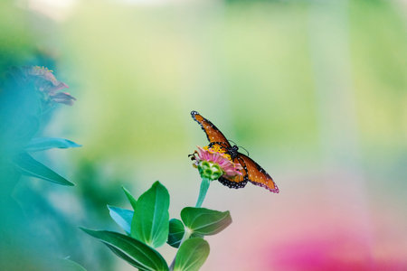 Beautiful monarch butterfly on pink flower in the garden, nature background