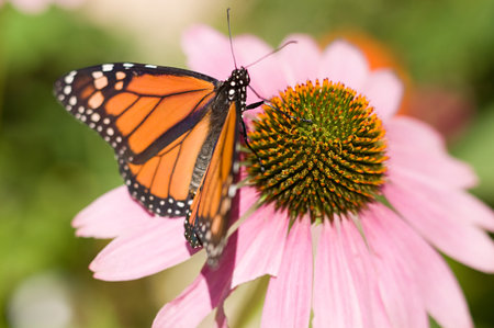 Monarch butterfly on bright purple coneflowers in the sun, July in Waukesha County, Wisconsin.