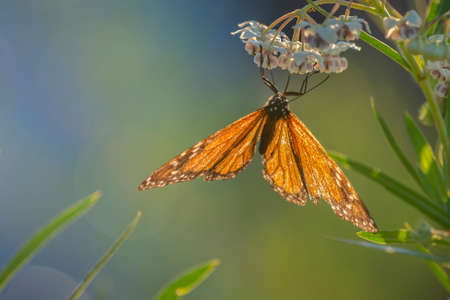 Queen butterfly (Danaus gilippus) feeding on Greggs Mistflowers (Conoclinium greggii) in the autumn garden. Natural green background with copy space.