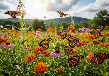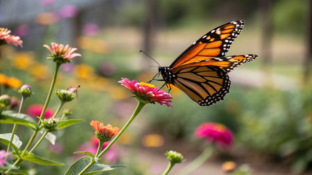 Monarch butterflies flutter among blooming flowers in a lively garden filled with colors and sunlight.