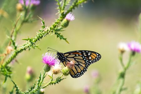 Monarch butterfly resting among thistles