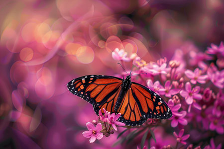 A monarch butterfly settles on lush blossoms in a blooming garden filled with vibrant colors and scents.