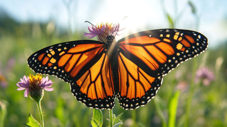 A Monarch butterfly rests gently on a purple flower, bathed in the warm glow of the setting sun. A serene and beautiful scene.