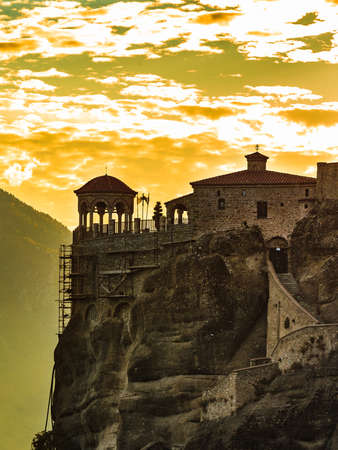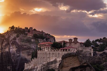 Scenic sunset evening sky over holy Varlaam monastery on cliff in Meteora, Thessaly Greece. Greek destinations