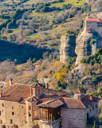 Varlaam monastery, located on a unique rock formation above the village of Kalambaka during fall season.