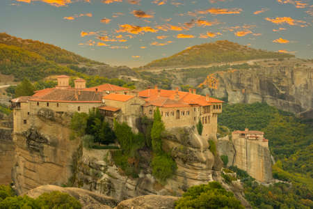 Greece. Sunset in summer Meteora. rock monastery and amazing sky