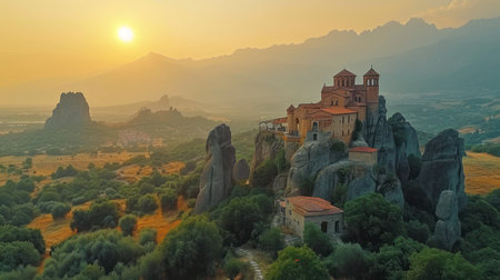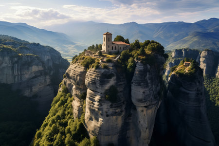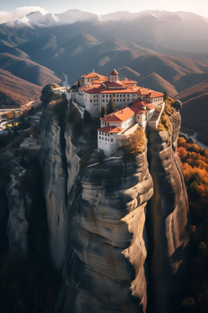 Generative AI : Aerial view of Iera Moni Barlaam Monastery on a natural pillar rock formation in Meteora Trikala Thessaly Greece