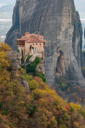 Roussanou monastery, located on a unique rock formation above the village of Kalambaka during fall season.