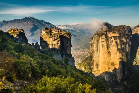 Monastery Meteora Greece. Stunning summer panoramic landscape. View at mountains and green forest against epic blue sky clouds. list object.
