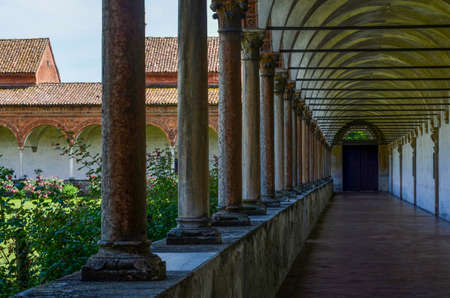 PAVIA, ITALY - JUNE 12, 2016 - The cloister of the chartreuse of Pavia on june 12, 2016. The chartreuse is an important example of renaissance religious architecture